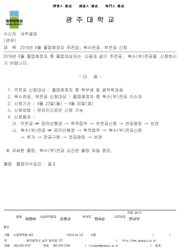 2019년 8월 졸업예정자 주전공, 복수정공, 부전공 신청 안내