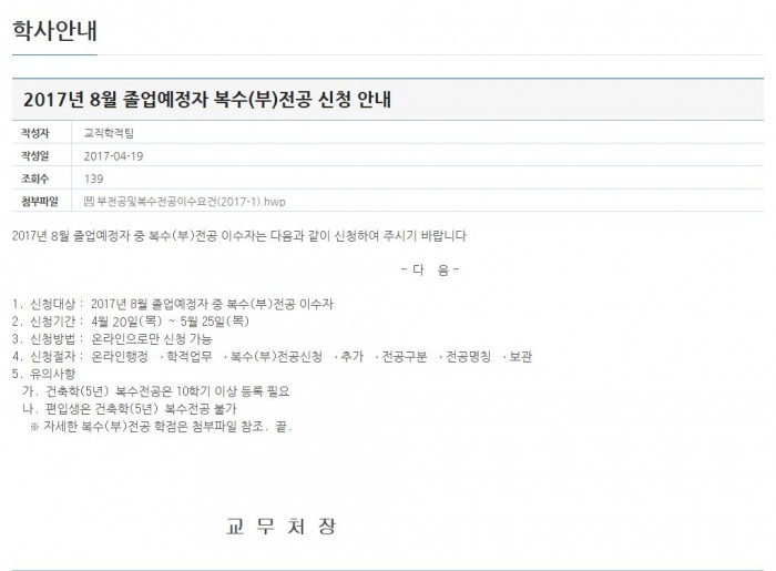 2017년 8월 졸업예정자 복수(부)전공 신청 안내