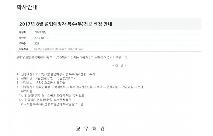2017년 8월 졸업예정자 복수(부)전공 신청 안내 페이지 정보 작성자 학과관리자 댓글 0건 조회 516회 작성일 17-05-24 16:03 목록 본문 자세한 내용은 광주대학교 홈페이지 학사안내에서 확인해주시기 바랍니다.링크) http://www.gwangju.ac.kr/_prog/_board/?mode=V&no=2036947&code=sub6_060102&site_dvs_cd=kr&menu_dvs_cd=060102&skey=&sval=&site_dvs=&stype=&GotoPage= 이전글2017년도 2학기 사회복지현장실습 OT 안내 17.05.31 다음글노인복지현장 탐방 참가신청 17.05.19 댓글 0 댓글목록 등록된 댓글이 없습니다.