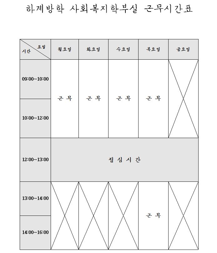 2017 하계방학 사회복지학부실 근무시간표입니다.