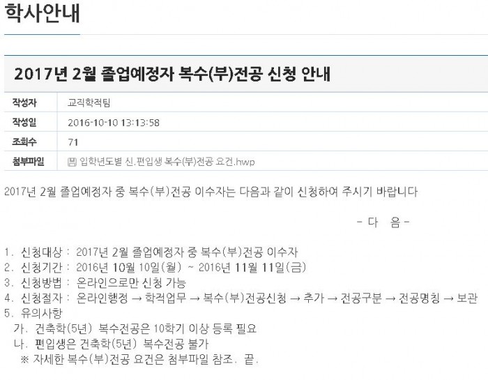 2017년 2월 졸업예정자 복수(부)전공 신청 안내 페이지 정보 작성자 학과관리자 댓글 0건 조회 740회 작성일 16-10-11 09:51 목록 본문 자세한 안내는 062) 670 - 2737 /교직학적팀으로 문의 부탁 드리겠습니다. 광주대학교 공지사항 : http://www.gwangju.ac.kr/_prog/_board/?mode=V&no=2032765&code=sub6_060102&site_dvs_cd=kr&menu_dvs_cd=060102&skey=&sval=&site_dvs=&stype=&GotoPage= 이전글수업 관리 안내(외래강사, 학부교수) 16.10.17 다음글2017년 2월 졸업예정자 주전공 신청 안내 16.10.11 댓글 0 댓글목록 등록된 댓글이 없습니다.