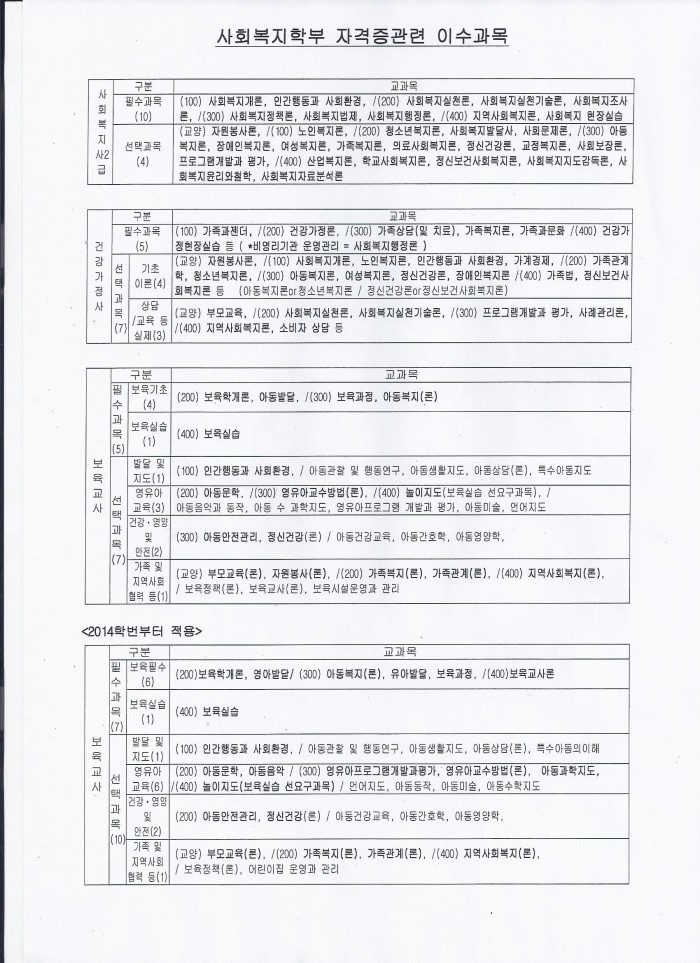사회복지사2급, 건강가정사, 보육교사 자격증 과목이수표