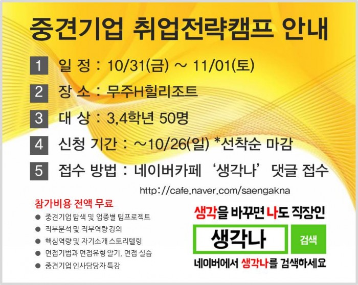 취업전략캠프 프로그램 페이지 정보 작성자 관리자 댓글 0건 조회 2,055회 작성일 14-10-01 11:19 목록 본문 안녕하세요 호심인재개발원 인재개발팀 입니다. 홍보하는 내용은 위와 같이 중견기업 취업전략캠프 프로그램입니다. http://cafe.naver.com/saengakna 이전글청춘이 퍼플을 입다- 연극홍보안내! 14.10.01 다음글이번 청소년지도사 자격증 원서접수 신청한 학생들에게 알립니다! 14.09.29 댓글 0 댓글목록 등록된 댓글이 없습니다.