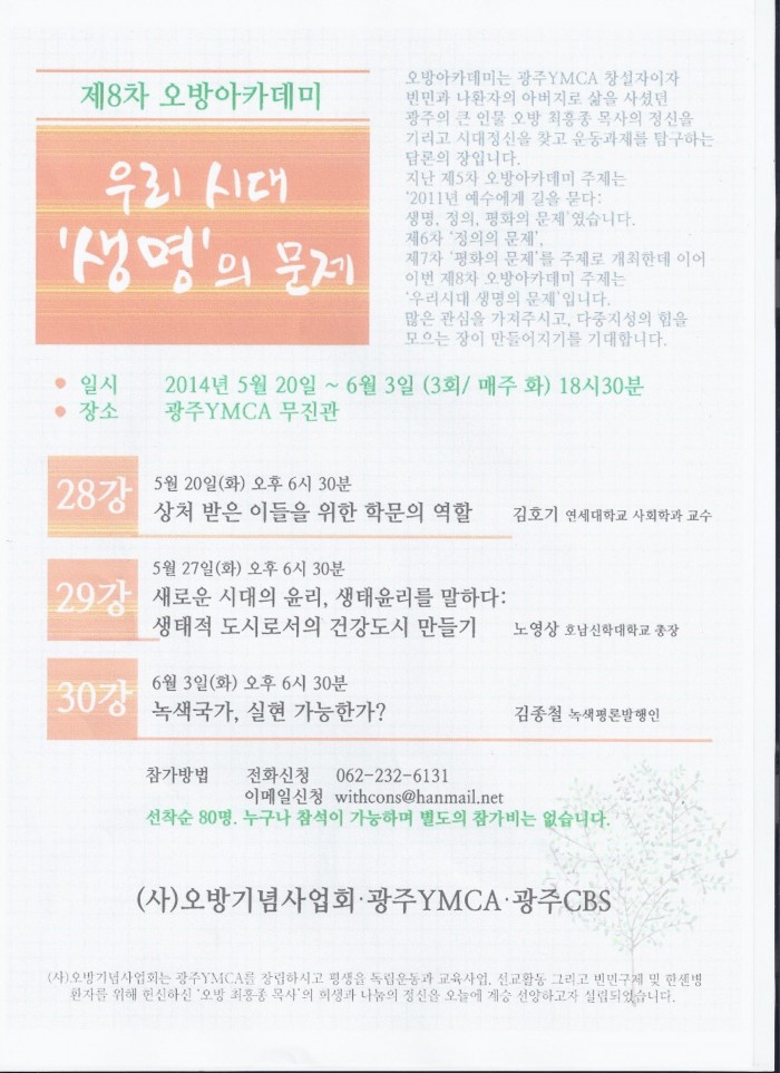 광주YMCA 제8차오방아카데미 안내 페이지 정보 작성자 관리자 댓글 0건 조회 1,768회 작성일 14-04-30 14:14 목록 본문 이전글하계 계절학기 보육관련 교과목 설강 희망자 조사 14.05.02 다음글평생교육실습 오리엔테이션관련!! 14.04.29 댓글 0 댓글목록 등록된 댓글이 없습니다.