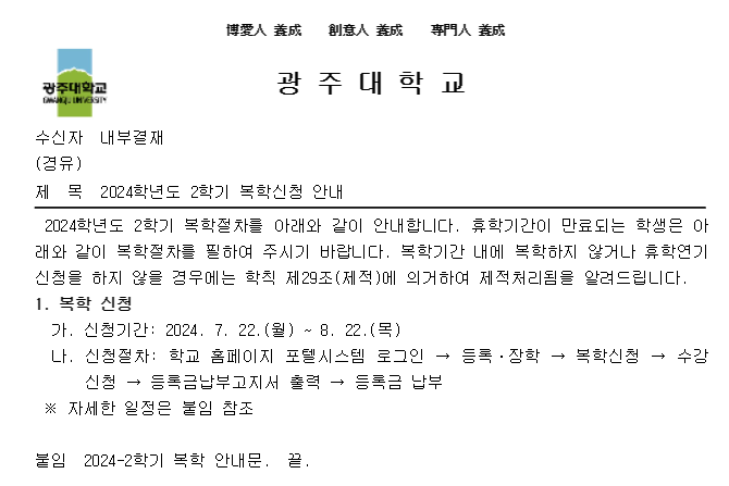 2024년 2학기 복학 안내 페이지 정보 작성자 학과관리자 댓글 0건 조회 275회 작성일 24-07-11 10:46 목록 본문 이전글2024년 2학기 재입학 안내 24.07.11 다음글2024년 2학기 개강일 및 수강신청 일정 안내 24.07.11 댓글 0 댓글목록 등록된 댓글이 없습니다.