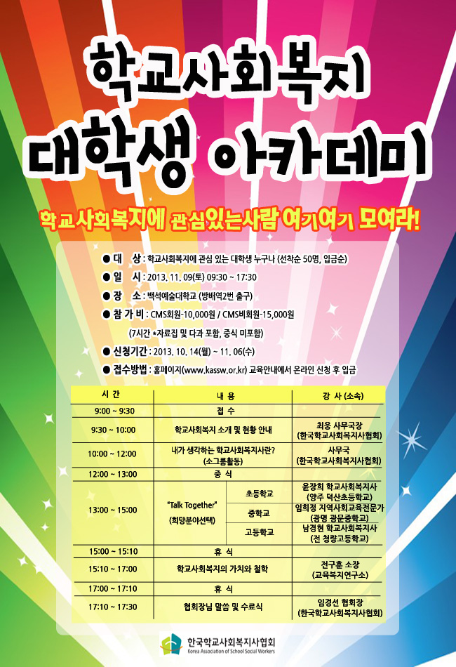 [13-063] 2013 학교사회복지 대학생 아카데미 참여 모집 안내.pdf (320.2K)