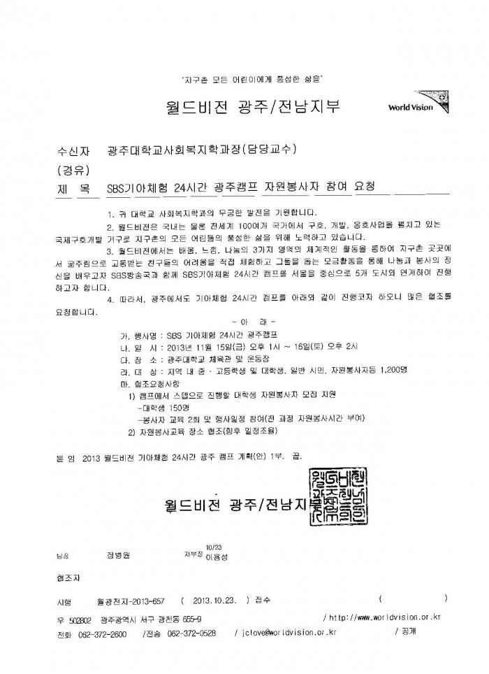 기아 체험 자원봉사자 모집 페이지 정보 작성자 관리자 댓글 0건 조회 946회 작성일 13-11-06 19:53 목록 본문 첨부 파일을 확인 하시어 기아 체험을 하시기 바랍니다. 이전글사회복지시설 취업특강 날짜 변경 13.11.11 다음글2013-2학기 사회복지 기관탐방!!! 13.10.28 댓글 0 댓글목록 등록된 댓글이 없습니다.