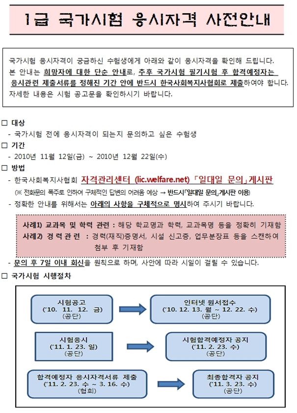 2011년도 제9회 사회복지사1급국가시험 응시자격 사전안내 페이지 정보 작성자 학부실 댓글 0건 조회 1,101회 작성일 10-11-19 14:30 목록 본문 * 자세한 사항은 한국사회복지사협회 홈페이지를 확인해주시기를 바립니다.http://www.welfare.net/site/Index.action 이전글사회복지시설 및 기관 현장탐방 지원사업 공모 10.11.22 다음글컴퓨터자격증 응시료지원 10.11.30 댓글 0 댓글목록 등록된 댓글이 없습니다.