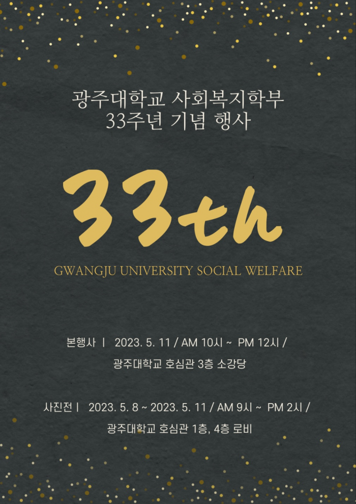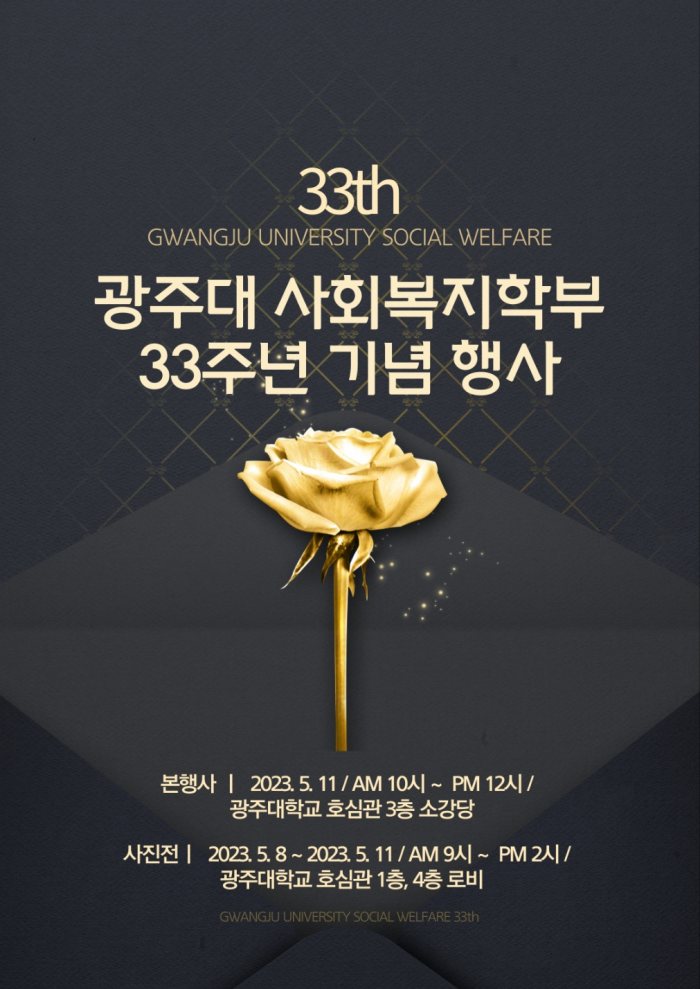 광주대학교 사회복지학부 33주년 기념행사 페이지 정보 작성자 학과관리자 댓글 0건 조회 277회 작성일 23-05-01 09:06 목록 본문 . 이전글조기졸업 신청 안내 23.05.02 다음글2023년 1학기 사회복지학부실 근무 시간표 23.02.28 댓글 0 댓글목록 등록된 댓글이 없습니다.