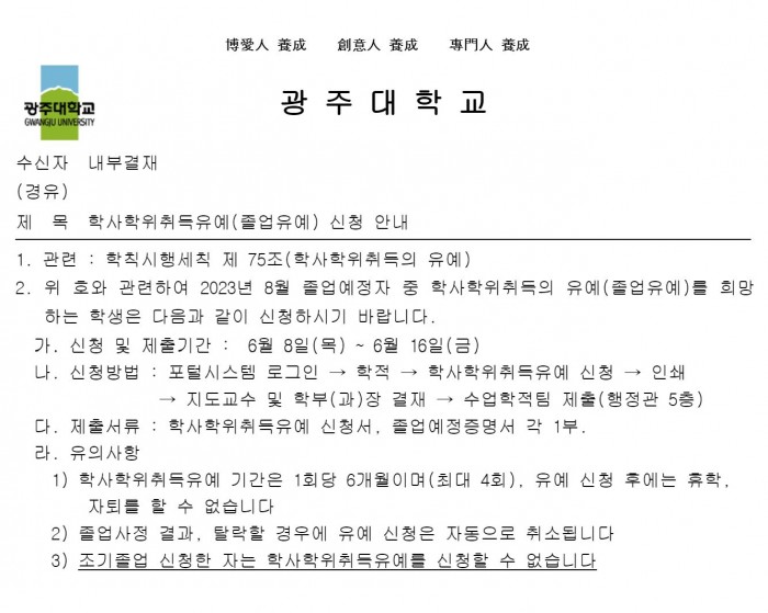 2023년 8월 졸업예정자 학사학위취득유예(졸업유예) 신청 페이지 정보 작성자 학과관리자 댓글 0건 조회 302회 작성일 23-06-05 13:15 목록 본문 . 이전글2023 하계방학 사회복지학부실 근무 시간표 23.06.23 다음글사회복지현장실습 발표회 초대합니다. 23.05.24 댓글 0 댓글목록 등록된 댓글이 없습니다.