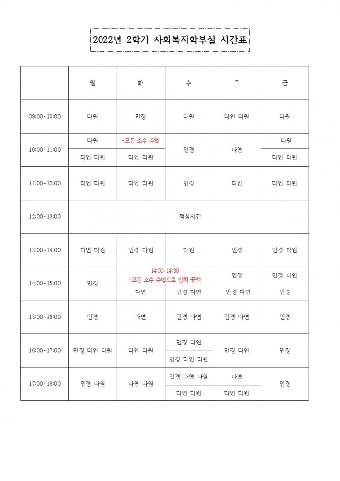 2022-2 사회복지학부 사무실 근무 시간표입니다.