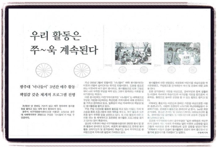 사회복지학부 소모임 "너나들이" 가 무등일보에 기사가 실려서 작게는 사회복지학부를 크게는 광주대학교를 널리 알리었답니다.