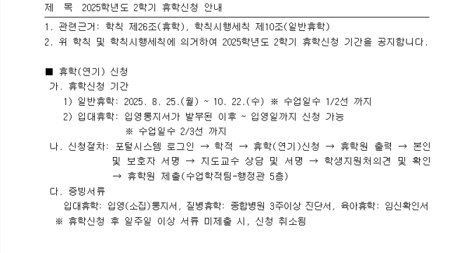 2025학년도 2학기 휴학신청 안내 페이지 정보 작성자 학과관리자 댓글 0건 조회 94회 작성일 25-08-26 10:36 목록 본문 . 이전글편입생! “슬기로운 대학생활” 간담회 안내 25.09.30 다음글2025학년도 2학기 개강일 및 수강신청 일정 안내 25.08.14 댓글 0 댓글목록 등록된 댓글이 없습니다.