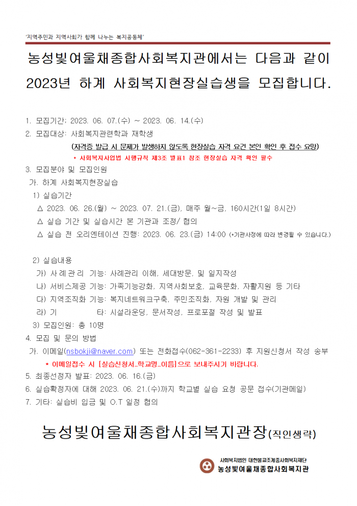 (모집기간 연장6/23)2023년 예비사회복지사 하계 사회복지현장실습생 모집 공고_농성빛여울채종합사회복지관