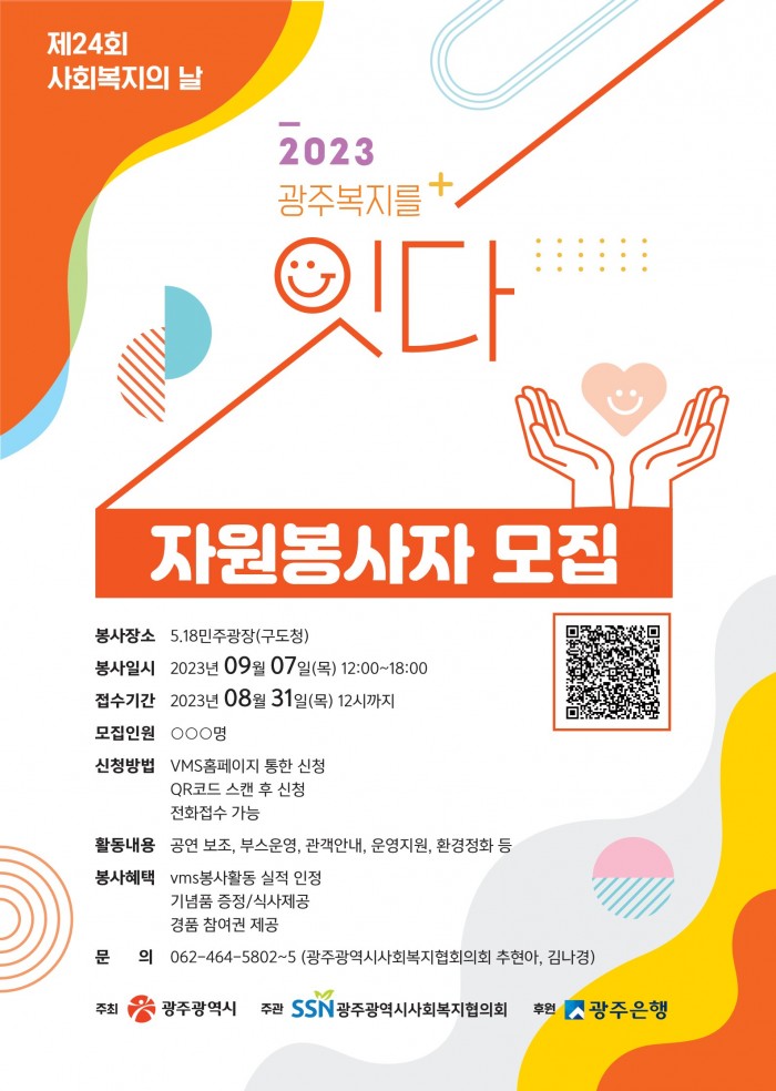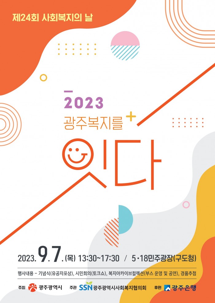 1. 광주광역시사회복지협의회에서는 사회복지의날(사회복지사업법 제15조의 2)을 맞이하여 9월 7일 목요일 518민주광장(구도청)에서 「제24회 사회복지의 날 기념식 및 한마음 축제」를 개최합니다.