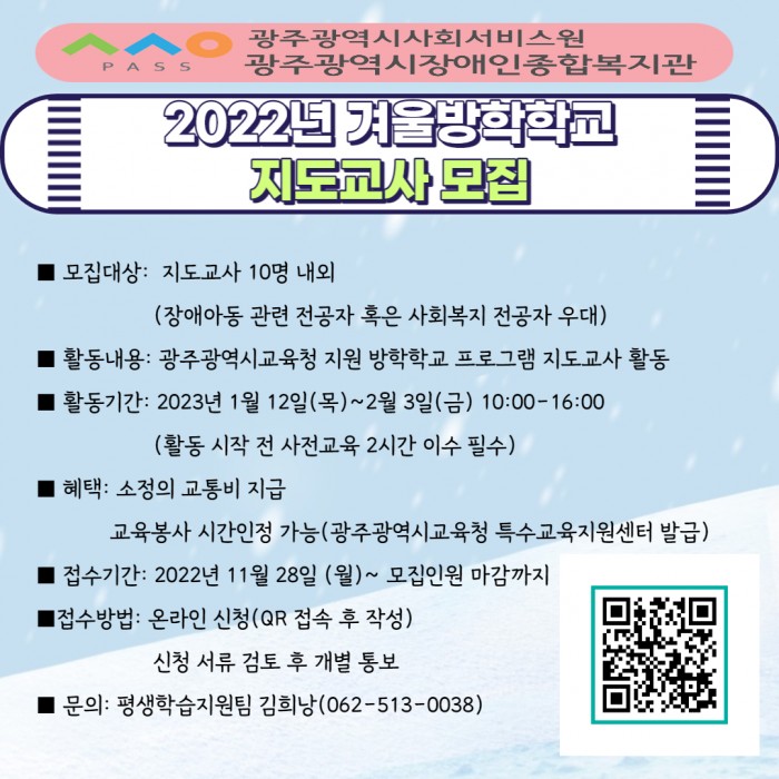 - 다음글2022 장애학생 겨울방학학교 지도교사 모집 안내(광주서구장애인복지관) 22.12.01