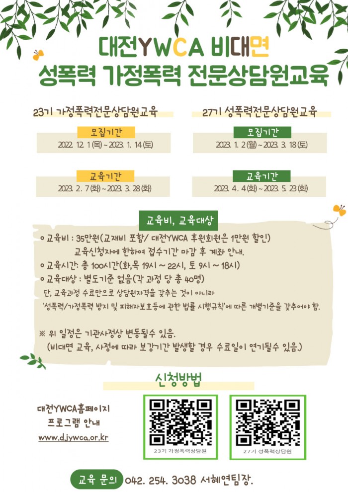 [사단법인 대전YWCA] 2023년 성폭력/가정폭력전문상담원교육(비대면)] 모집안내