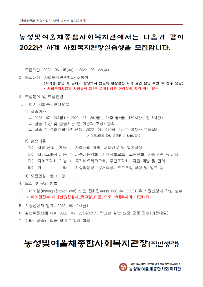 [농성빛여울채종합사회복지관 2022-2 하계사회복지현장실습생 모집 안내]