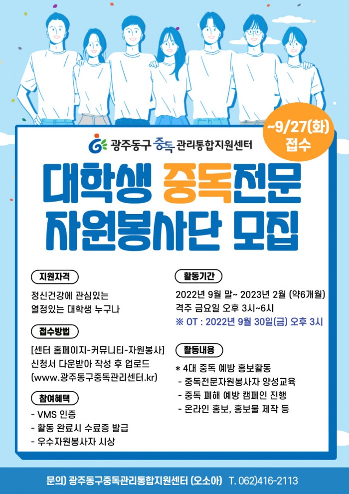 [광주동구중독관리통합지원센터 대학생 중독전문자원봉사단 모집 안내] 페이지 정보 작성자 학과관리자 댓글 0건 조회 160회 작성일 22-09-13 11:39 목록 본문 . 이전글광주광역시서구장애인복지관 직원 채용 공고(최중증 발달장애인 융합돌봄센터) 22.09.15 다음글동그라미재단 O-Prize(오프라이즈) 사회문제 해결 아이디어+솔루션 공모전 22.09.08 댓글 0 댓글목록 등록된 댓글이 없습니다.