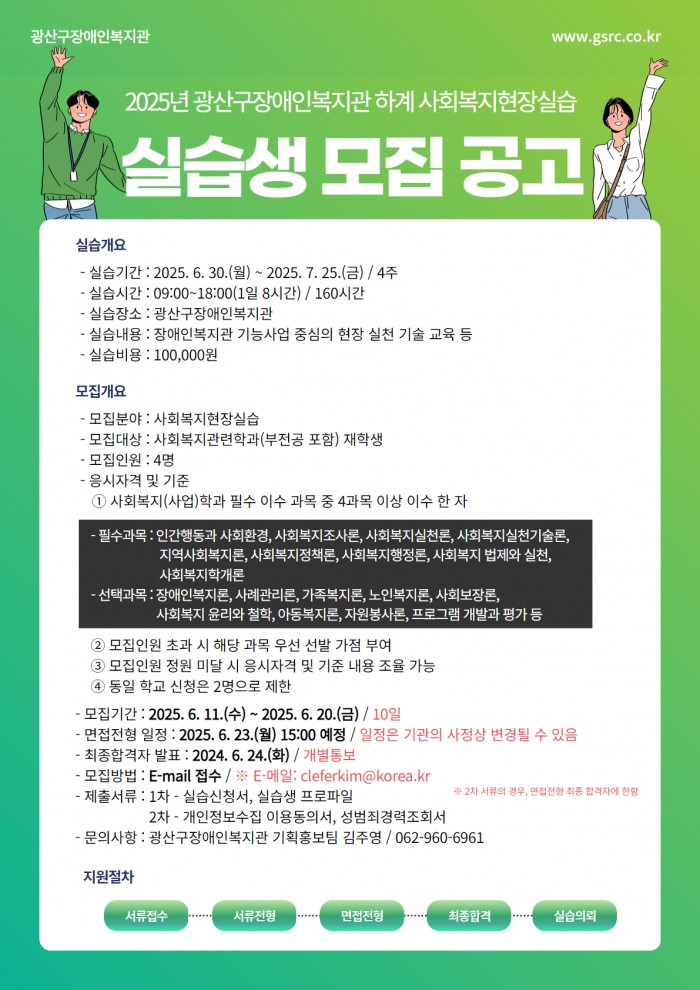 광산구장애인복지관 하계 실습생 모집 안내문입니다.