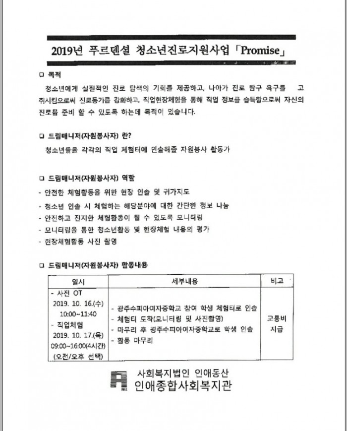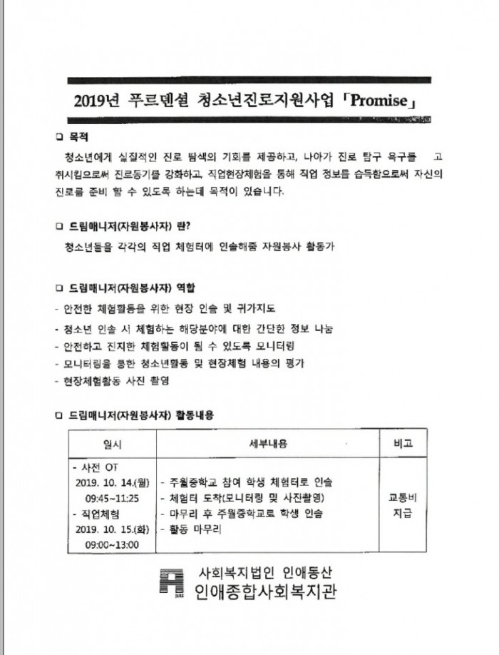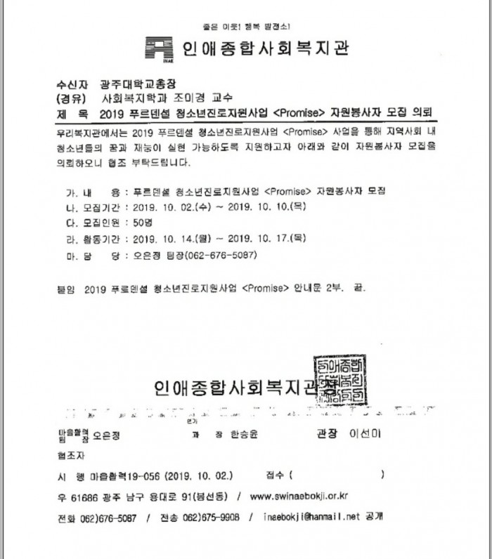 푸르덴셜 청소년진로지원사업 자원봉사모집안내 페이지 정보 작성자 학과관리자 댓글 0건 조회 216회 작성일 19-10-07 19:22 목록 본문 문의 062)670-2641~2 이전글2019장애인일상생활보조기기 ICT 메이커톤 19.10.22 다음글지구촌사회복지재단 사회복지 프로그램 공모전 19.09.27 댓글 0 댓글목록 등록된 댓글이 없습니다.
