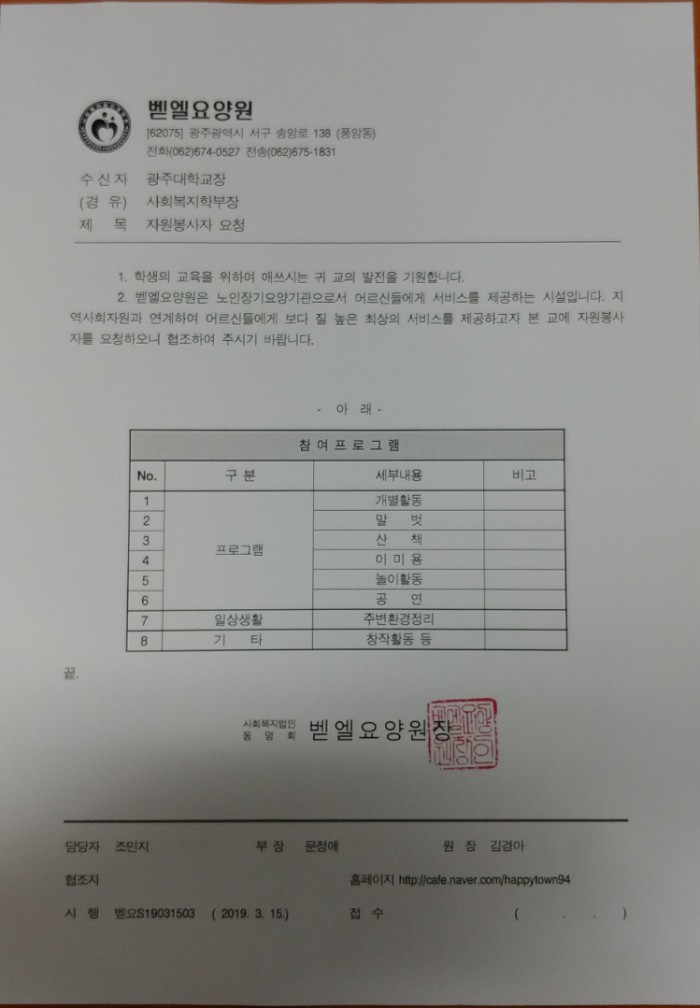 벧엘요양원 자원봉사자 모집 페이지 정보 작성자 학과관리자 댓글 0건 조회 255회 작성일 19-03-21 09:25 목록 본문 벧엘요양원 자원봉사자 모집 문의 : 062)674-0527 이전글동구청소년상담복지센터 보드미 멘토단 모집 19.03.27 다음글광주장애인부모연대 장애아가족 양육지원팀 - 장애아돌보미 양성교육 19.03.14 댓글 0 댓글목록 등록된 댓글이 없습니다.