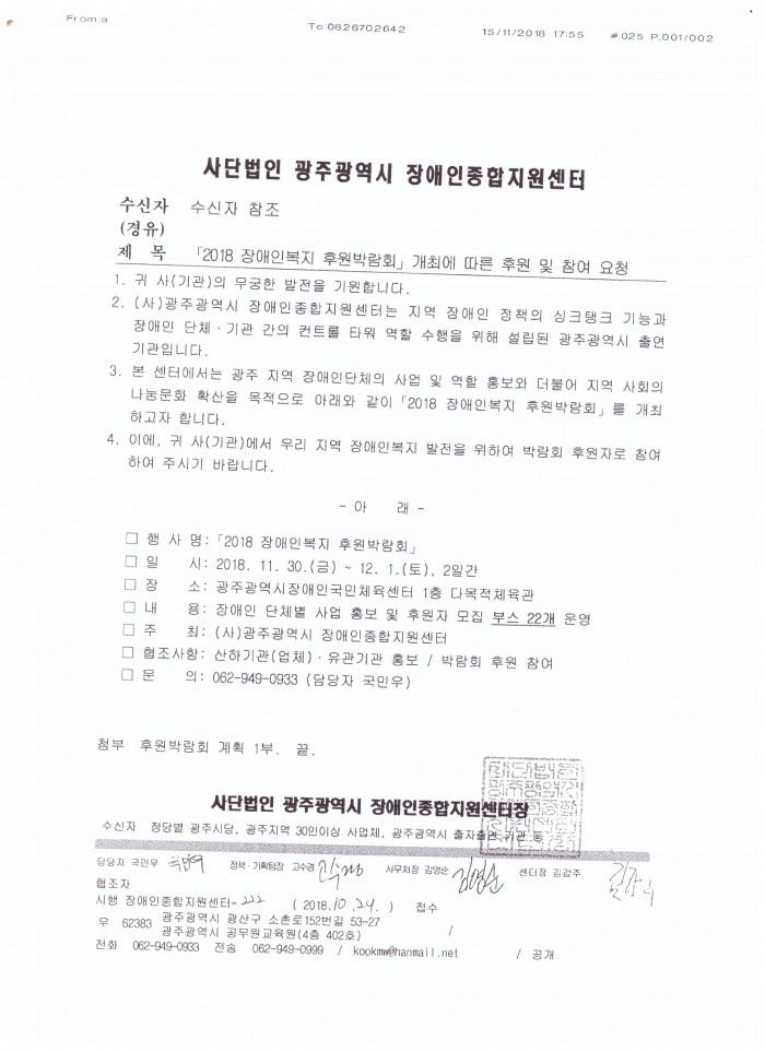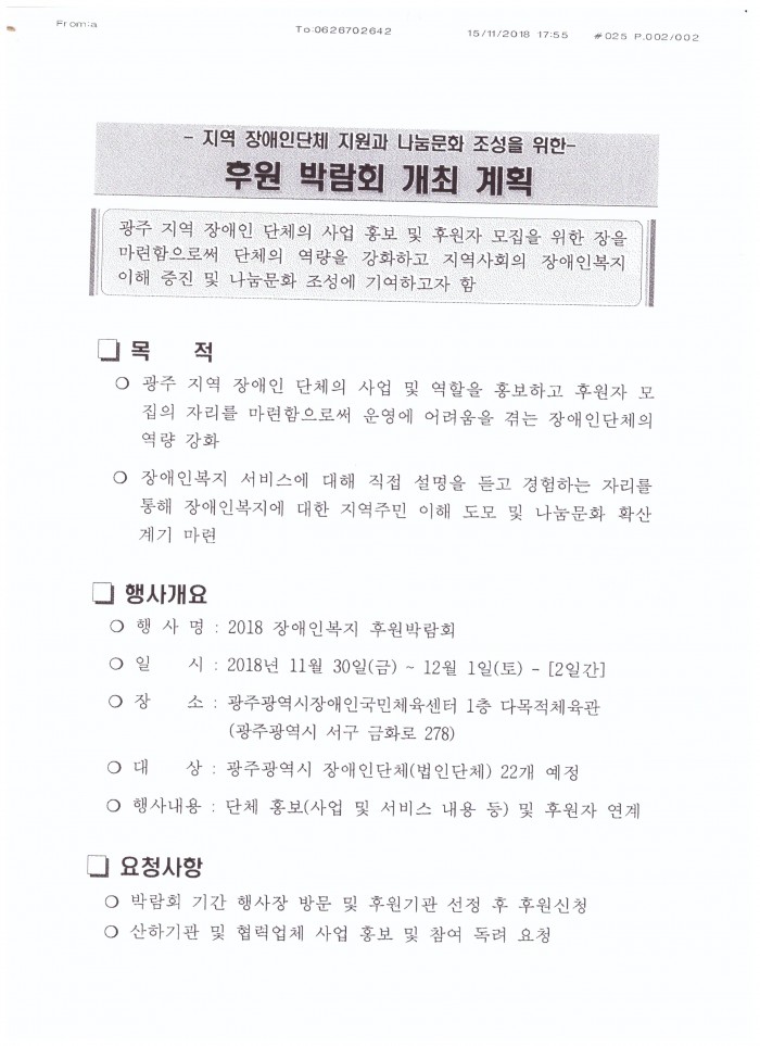2018 장애인복지 후원박람회 개최에 다른 후원 및 참여 요청