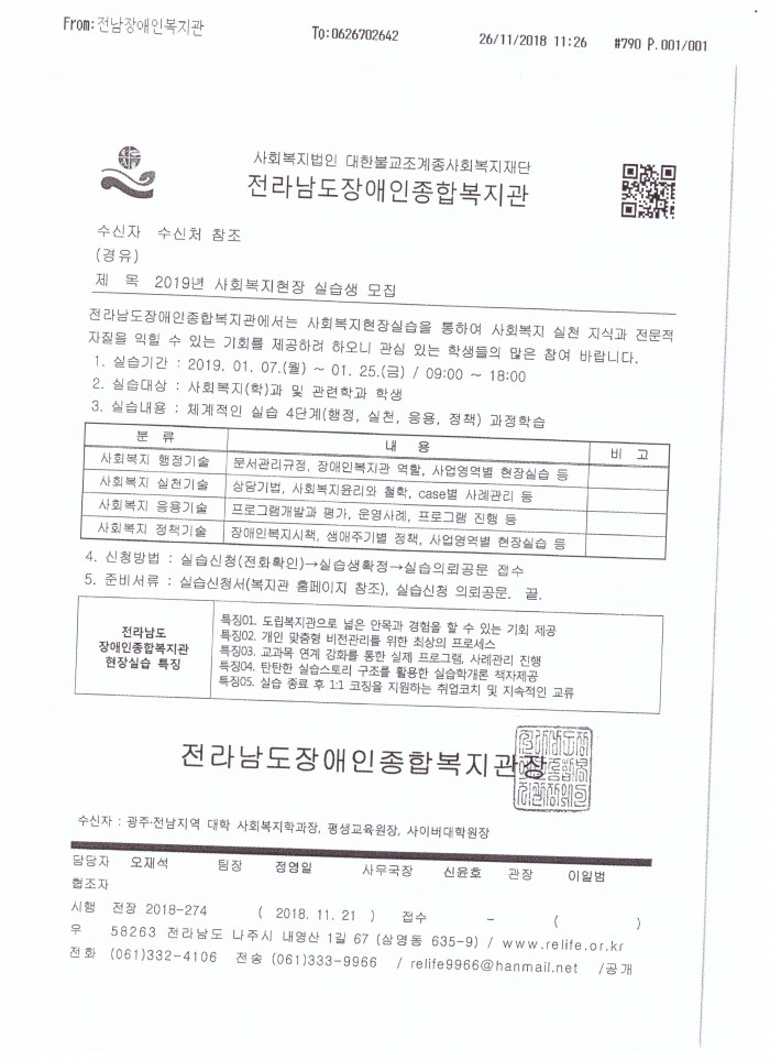 실습생 모집 공고(전라남도장애인종합복지관) 페이지 정보 작성자 학과관리자 댓글 0건 조회 274회 작성일 18-11-26 12:53 목록 본문 문의: 정영일 팀장(062-332-4106) 이전글실습생 모집 공고(동구정신건강복지센터) 18.11.30 다음글북구청소년수련관 방과후아카데미 봉사자 모집 18.11.21 댓글 0 댓글목록 등록된 댓글이 없습니다.