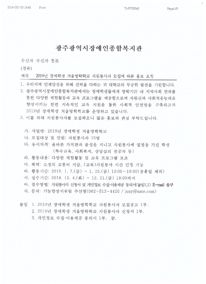 자원봉사자 모집(광주광역시장애인종합복지관)