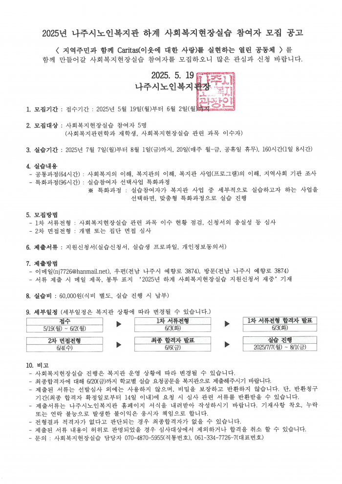 2025년 나주시노인복지관 하계 사회복지현장실습 참여자 모집