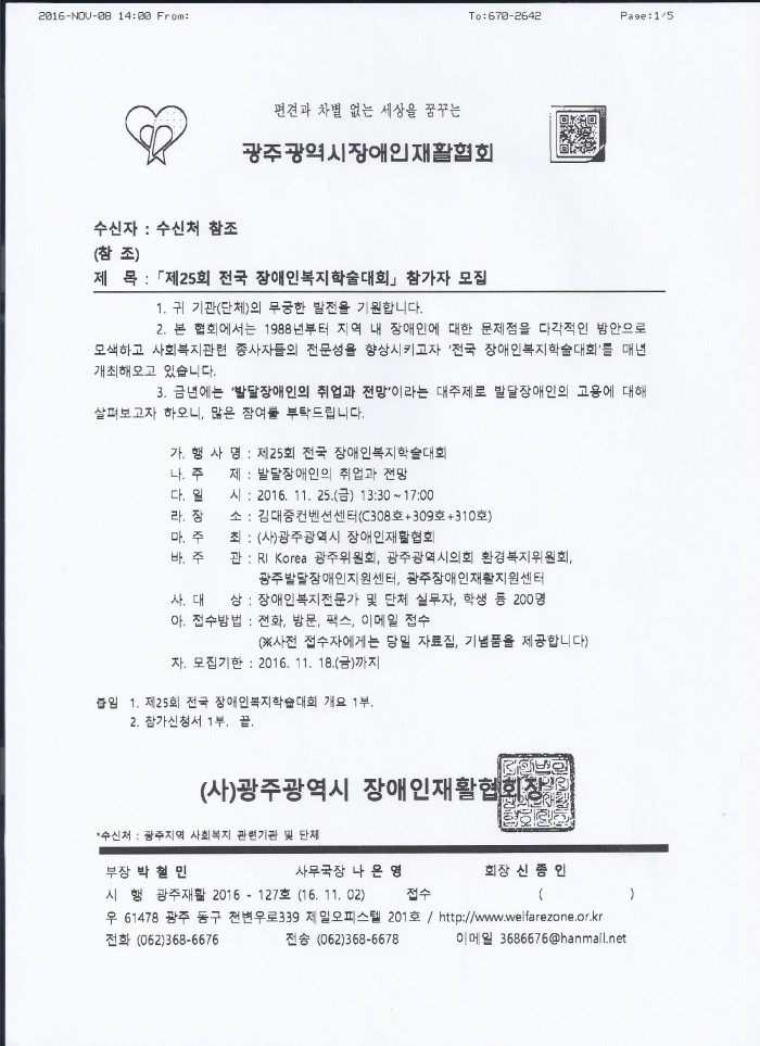 광주광역시장애인재활협회 - 『제25회 전국 장애인복지학술대회』참가자 모집 페이지 정보 작성자 학과관리자 댓글 0건 조회 514회 작성일 16-11-10 13:14 목록 본문 많은 관심과 협조 부탁드립니다. 이전글KT&G 상상univ. '한마음 체육대회' 홍보 16.11.14 다음글서구청소년상담복지센터 - 대학생을 위한 예비부모교육 「금수저보다 좋은 금부모 되는 방법」 16.11.10 댓글 0 댓글목록 등록된 댓글이 없습니다.