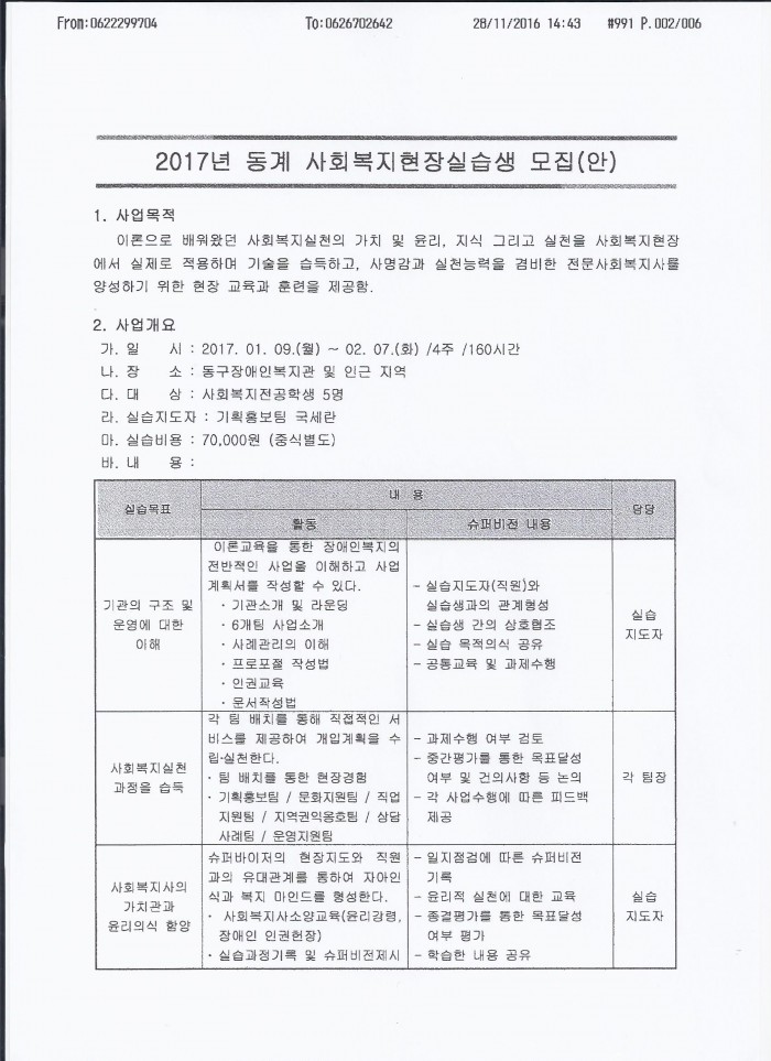 1. 사업명 : 2017년 동계 사회복지현장실습