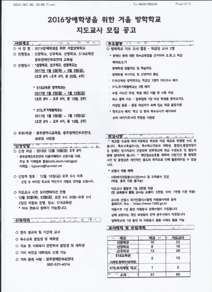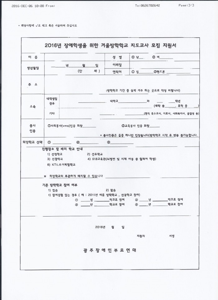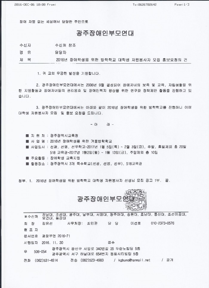 광주장애인부모연대 - 2016년 장애학생을 위한 방학학교 대학생 자원봉사자 모집 페이지 정보 작성자 학과관리자 댓글 0건 조회 705회 작성일 16-12-06 16:48 목록 본문 . 이전글KBS 1TV <동행> 촬영 협조 16.12.09 다음글광주 서구 건강가정지원센터 - 다문화가족지원센터 4분기 운영위원회 참석 요청 16.12.06 댓글 0 댓글목록 등록된 댓글이 없습니다.