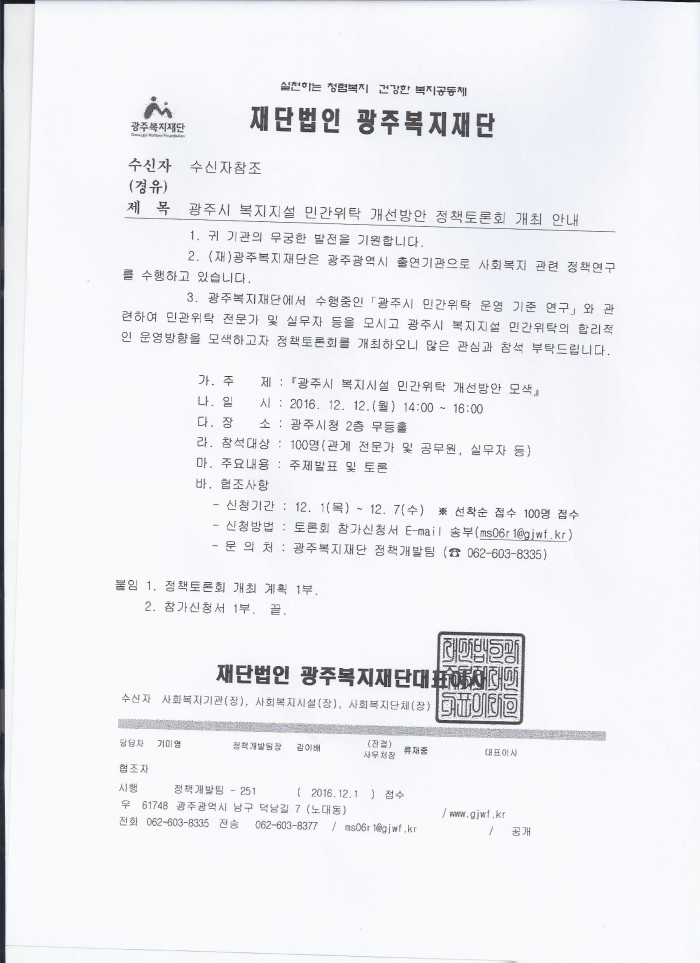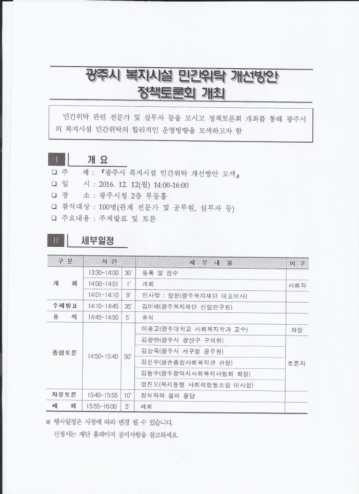 재단법인 광주복지재단 - 광주시 복지시설 민간위탁 개선방안 정책토론회 개최 페이지 정보 작성자 학과관리자 댓글 0건 조회 645회 작성일 16-12-09 17:32 목록 본문 . 이전글광주시립정신병원 정신보건사회복지사 수련생 모집공고 16.12.26 다음글KBS 1TV <동행> 촬영 협조 16.12.09 댓글 0 댓글목록 등록된 댓글이 없습니다.