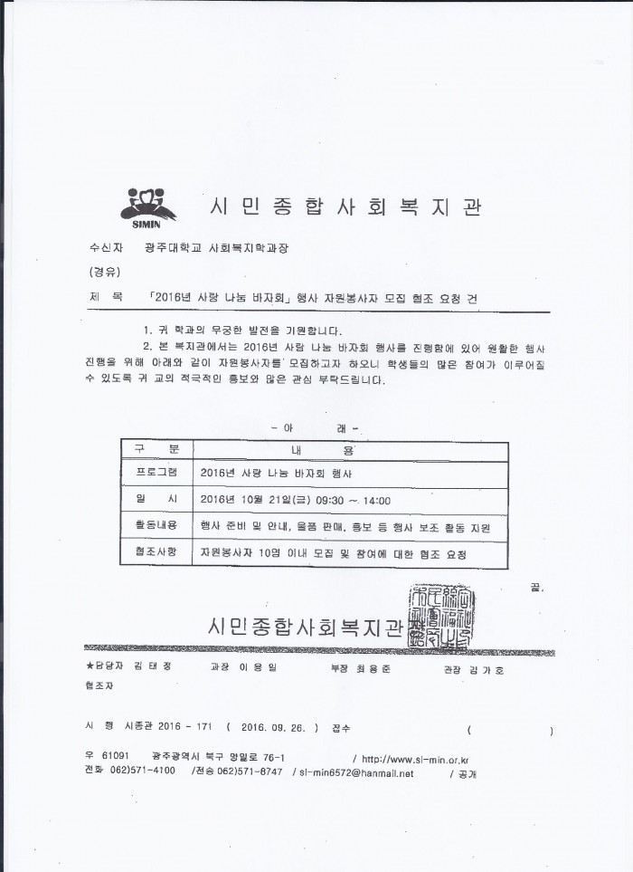 시민종합사회복지관 - 2016년 「사랑 나눔 바자회」행사 자원봉사자 모집 페이지 정보 작성자 학과관리자 댓글 0건 조회 626회 작성일 16-09-29 16:00 목록 본문 관심이 있으신 학우분들께서는 많은 참여 부탁 드리겠습니다. 이전글양지종합사회복지관 ' 어울림 THE울림' 마을 축제 안내 및 자원봉사모집 16.10.04 다음글월드비전 - 쌍촌골 가을소풍 자원봉사자 모집 16.09.27 댓글 0 댓글목록 등록된 댓글이 없습니다.