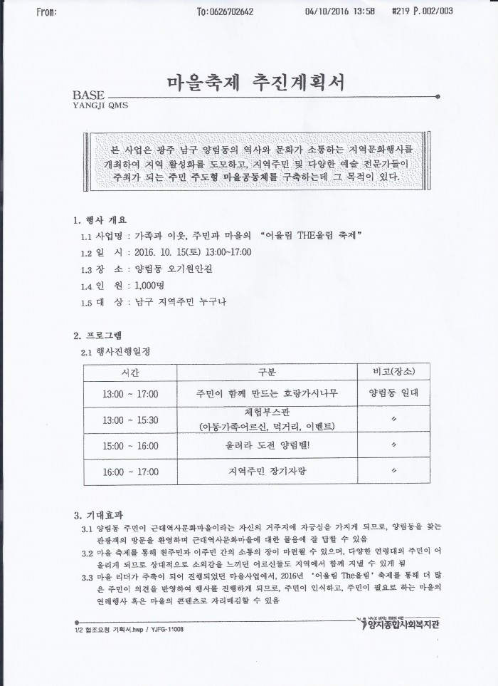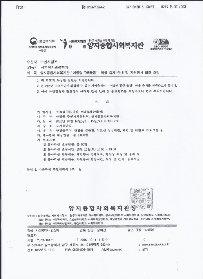 양지종합사회복지관 ' 어울림 THE울림' 마을 축제 안내 및 자원봉사모집 페이지 정보 작성자 학과관리자 댓글 0건 조회 480회 작성일 16-10-04 16:46 목록 본문 내용 참고 후 많은 참여 부탁드리겠습니다. 이전글빛고을종합사회복지관-제2회 지역주민나눔축제 "다함께 동동동" 자원봉사자 모집 16.10.10 다음글시민종합사회복지관 - 2016년 「사랑 나눔 바자회」행사 자원봉사자 모집 16.09.29 댓글 0 댓글목록 등록된 댓글이 없습니다.