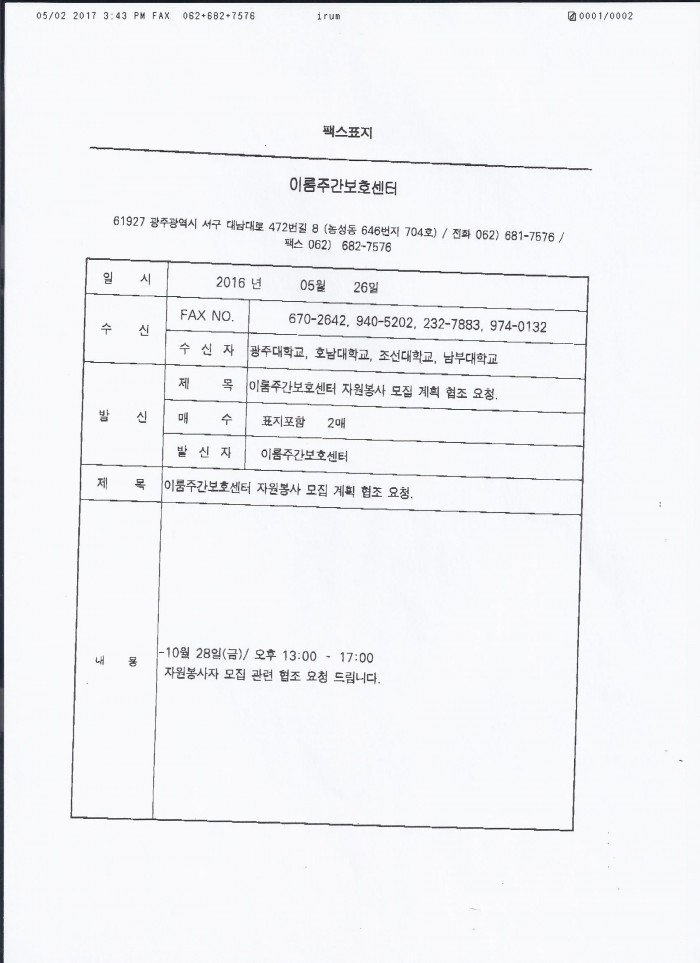 이름주간보호센터-이름주간보호센터 자원봉사자 모집 페이지 정보 작성자 학과관리자 댓글 0건 조회 495회 작성일 16-10-12 15:44 목록 본문 많은 관심 부탁드리겠습니다. 이전글무등종합사회복지관 가을나들이 자원봉사자 모집안내 16.10.13 다음글광주광역시시각장애인복지관-「제37회 시각장애인 흰지팡이의 날 기념 행사」 자원봉사자 모집 16.10.12 댓글 0 댓글목록 등록된 댓글이 없습니다.