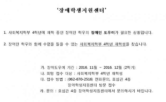 광주대학교 장애학습지원센터 장애인 도우미 모집 페이지 정보 작성자 학과관리자 댓글 0건 조회 681회 작성일 16-10-28 10:17 목록 본문 호심관 4층 장애학습지원센터에 문의하시기 바랍니다. 이전글서구청소년상담복지센터 - 대학생을 위한 예비부모교육 「금수저보다 좋은 금부모 되는 방법」 16.11.10 다음글광주여성장애인연대 자원봉사자 모집 16.10.21 댓글 0 댓글목록 등록된 댓글이 없습니다.