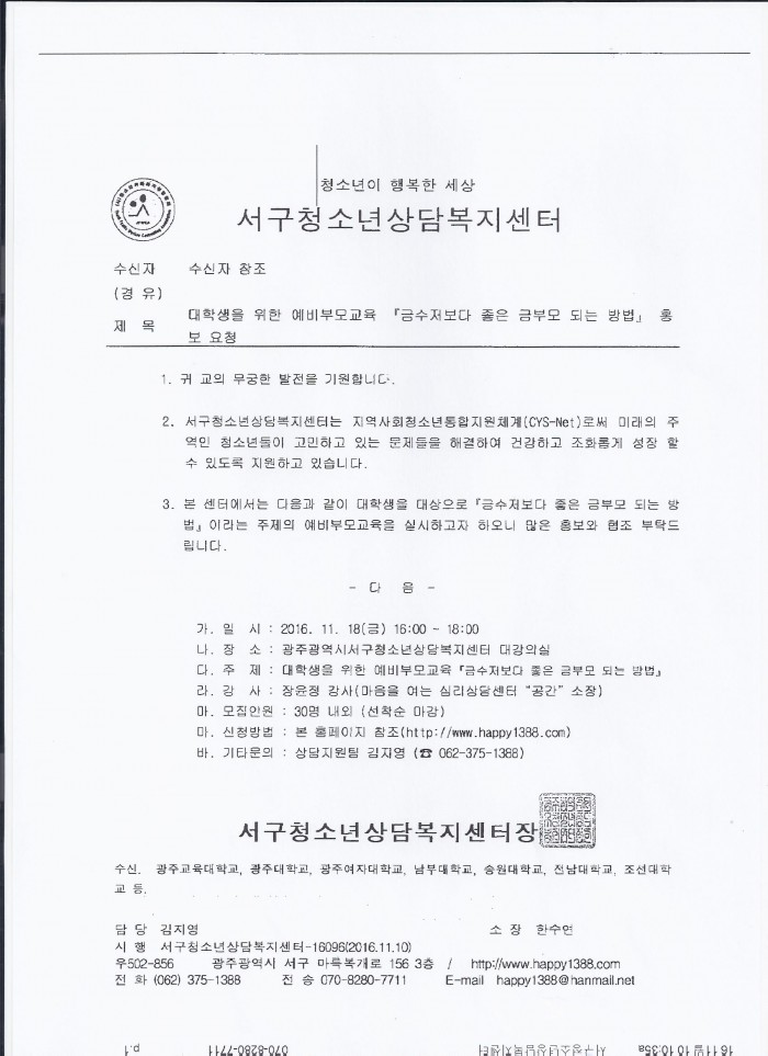 서구청소년상담복지센터 - 대학생을 위한 예비부모교육 「금수저보다 좋은 금부모 되는 방법」 페이지 정보 작성자 학과관리자 댓글 0건 조회 530회 작성일 16-11-10 13:08 목록 본문 . 이전글광주광역시장애인재활협회 - 『제25회 전국 장애인복지학술대회』참가자 모집 16.11.10 다음글광주대학교 장애학습지원센터 장애인 도우미 모집 16.10.28 댓글 0 댓글목록 등록된 댓글이 없습니다.