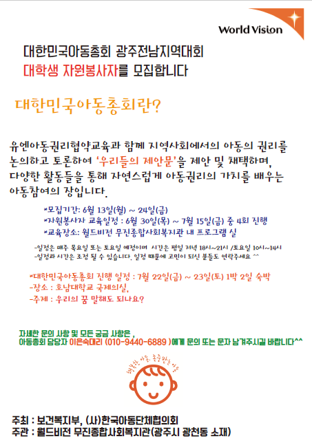대한민국 아동총회 광주전남지역대회 대학생 자원봉사자를 모집합니다.