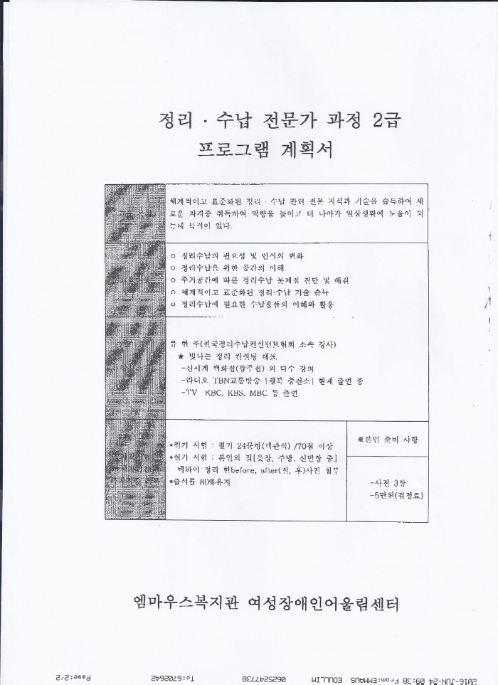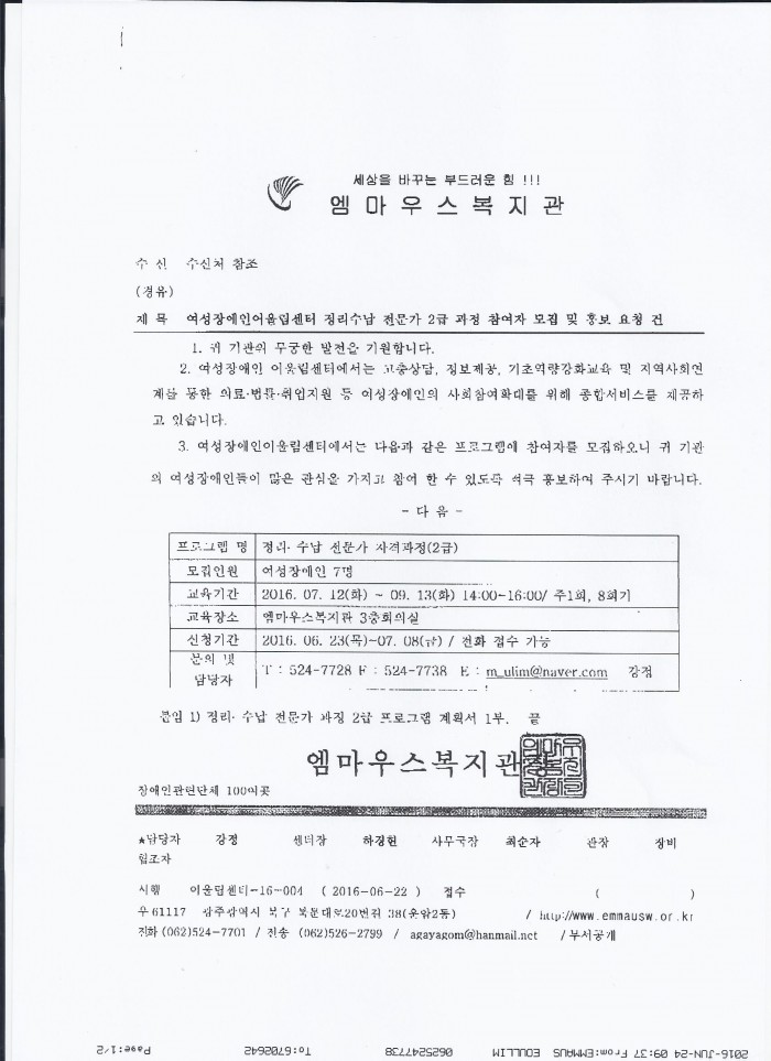 엠마우스복지관 - 여성장애인어울림센터 정리수납 전문가 2급 과정 참여자 모집 페이지 정보 작성자 관리자 댓글 0건 조회 501회 작성일 16-06-27 09:31 목록 본문 이전글빛고을종합사회복지관 - 2016년 사회양극화 해소사업 자원봉사자 모집 16.06.29 다음글2016년 사회복지현장실습 지도자 기초교육 강사양성 워크숍 안내 16.06.23 댓글 0 댓글목록 등록된 댓글이 없습니다.