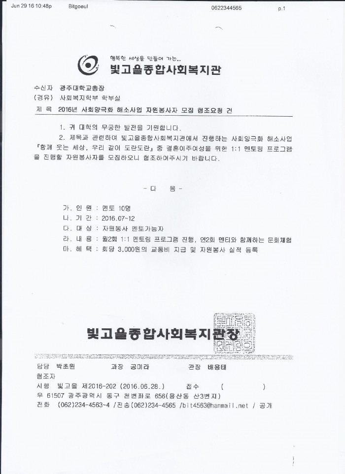 빛고을종합사회복지관 - 2016년 사회양극화 해소사업 자원봉사자 모집 페이지 정보 작성자 관리자 댓글 0건 조회 573회 작성일 16-06-29 12:38 목록 본문 이전글무등종합사회복지관- 2016년 무등종합사회복지관 멘토링 대학생멘토 자원봉사자모집 홍보 16.07.21 다음글엠마우스복지관 - 여성장애인어울림센터 정리수납 전문가 2급 과정 참여자 모집 16.06.27 댓글 0 댓글목록 등록된 댓글이 없습니다.
