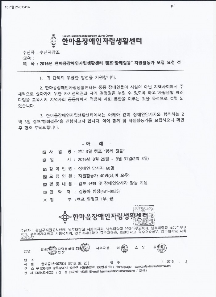 한마음장애인자립생활센터-2016년 한마음장애인자립생활센터 캠프"함께걸음" 자원활동가 모집 페이지 정보 작성자 관리자 댓글 0건 조회 635회 작성일 16-07-25 13:48 목록 본문 이전글 추가기능새창읽기인쇄메일 다운로드 [광주사회복지사협회] 2016년 보건복지분야 교육과정기획 공모전 안내 16.07.27 다음글무등종합사회복지관- 2016년 무등종합사회복지관 멘토링 대학생멘토 자원봉사자모집 홍보 16.07.21 댓글 0 댓글목록 등록된 댓글이 없습니다.