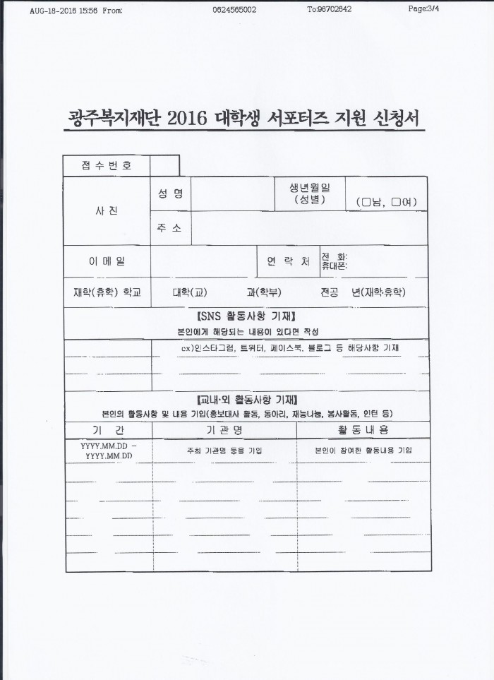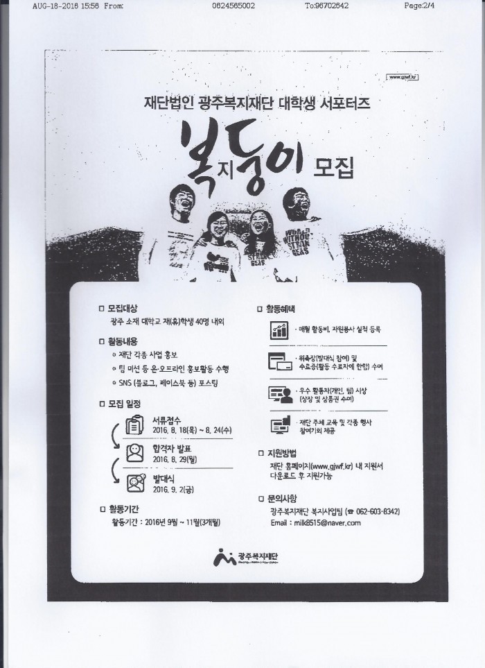 광주복지재단 대학생 서포터즈 모집 홍보 페이지 정보 작성자 관리자 댓글 0건 조회 507회 작성일 16-08-22 09:02 목록 본문 이전글2016 재) 평택복지재단 『복지 콘서트 1 』 참여 안내 16.08.22 다음글광주동구중독관리센터 대학생 자원봉사단 Let's Go 8기 모집 16.08.18 댓글 0 댓글목록 등록된 댓글이 없습니다.