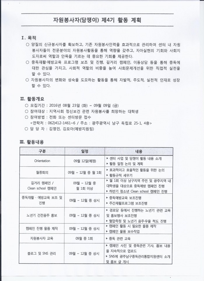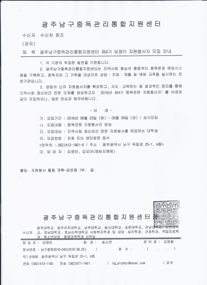 광주남구중독관리통합지원센터 제4기 담쟁이 자원봉사자 모집 페이지 정보 작성자 관리자 댓글 0건 조회 635회 작성일 16-08-23 10:53 목록 본문 이전글2016 광주 남구 취업박람회 자원봉사자 모집 16.08.25 다음글2016 재) 평택복지재단 『복지 콘서트 1 』 참여 안내 16.08.22 댓글 0 댓글목록 등록된 댓글이 없습니다.