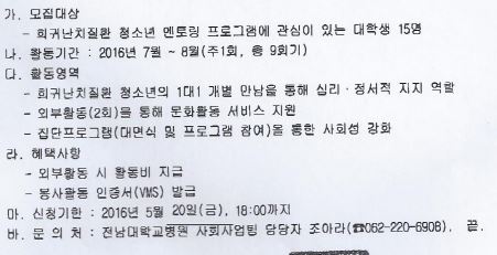 2016년 희귀난치질환 청소년 멘토링 참여자 모집 페이지 정보 작성자 관리자 댓글 0건 조회 472회 작성일 16-05-12 10:03 목록 본문 이전글마케팅 기획향상 직무역량 강화 캠프 참가자 모집 16.05.16 다음글 2016 글로벌마케터 양성과정(제5기) 참여학생 모집공고 16.04.28 댓글 0 댓글목록 등록된 댓글이 없습니다.