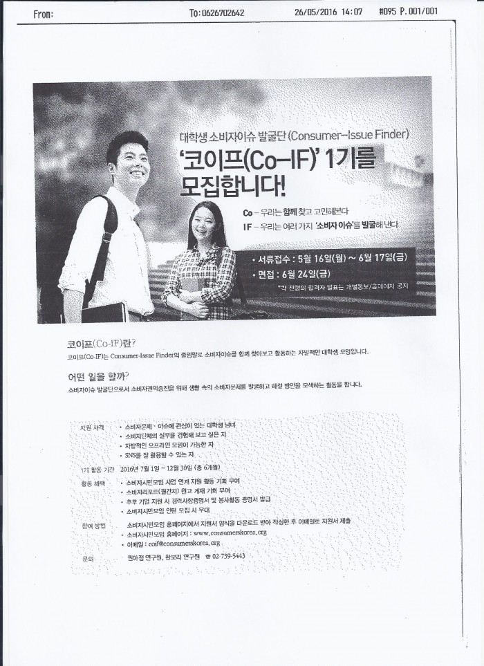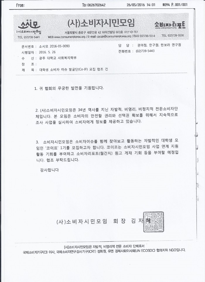(사)소비자시민모임-대학생 소비자 이슈 발굴단(Co-IF) 모집 페이지 정보 작성자 관리자 댓글 0건 조회 532회 작성일 16-05-26 14:23 목록 본문 이전글전라남도청소년미래재단 - 대학생 재능나눔 지원사업 개인.동아리 모집 16.06.03 다음글광주광역시시각장애인복지관-시각장애인과 함께하는 장애체험 자원봉사자 모집 16.05.26 댓글 0 댓글목록 등록된 댓글이 없습니다.