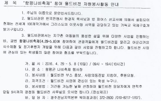 월드비전-"함평나비축제" 참여 월드비전 자원봉사자모집 페이지 정보 작성자 관리자 댓글 0건 조회 538회 작성일 16-04-25 13:49 목록 본문 이전글두암종합사회복지관-제44회 어버이날 기념행사 '효(孝)드림' 참석요청 16.04.26 다음글빛고을종합사회복지관 - 2016 어버이날 행사 자원봉사자 모집 16.04.25 댓글 0 댓글목록 등록된 댓글이 없습니다.
