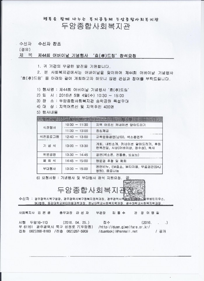 두암종합사회복지관-제44회 어버이날 기념행사 '효(孝)드림' 참석요청 페이지 정보 작성자 관리자 댓글 0건 조회 584회 작성일 16-04-26 13:42 목록 본문 이전글2016 민간자격증 수강안내 - 성현아카데미 교육원 16.04.26 다음글월드비전-"함평나비축제" 참여 월드비전 자원봉사자모집 16.04.25 댓글 0 댓글목록 등록된 댓글이 없습니다.