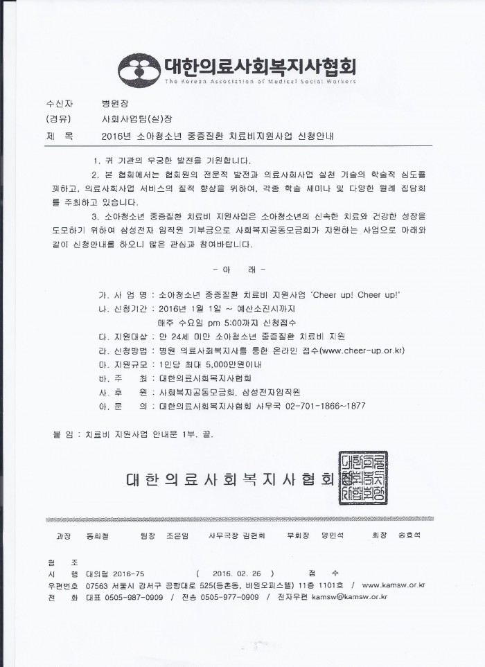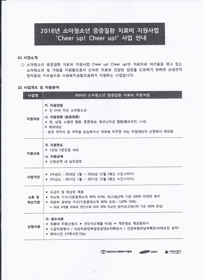 소아청소년 중증질환 치료비 지원사업'Cheer up! Cheer up!' 입니다.